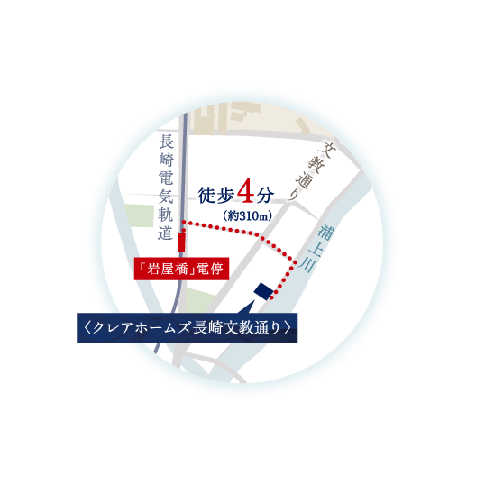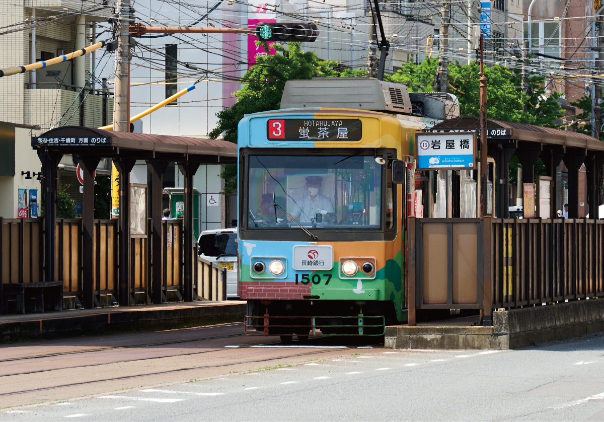 最寄りの「岩屋橋」電停へはフラットに徒歩4分。通勤、お出かけなど中心市街地へ快適にアクセスできます。